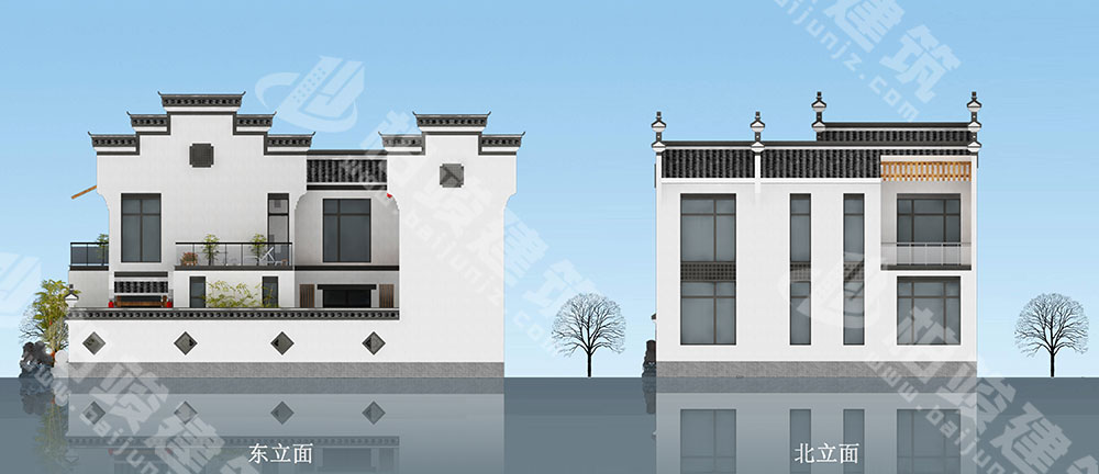 屋頂造型:黛色瀝青瓦鋪設(shè)硬山頂,利防風火