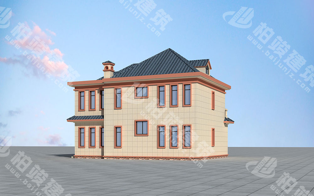 屋頂造型:平坡結合,灰藍色瓦片鋪設錯落坡頂,平頂處可放置水箱,美觀實用兼而有之
